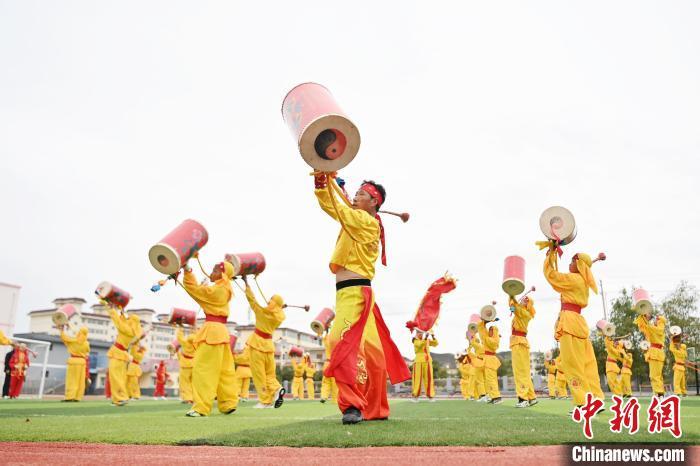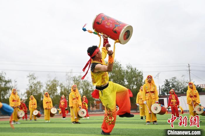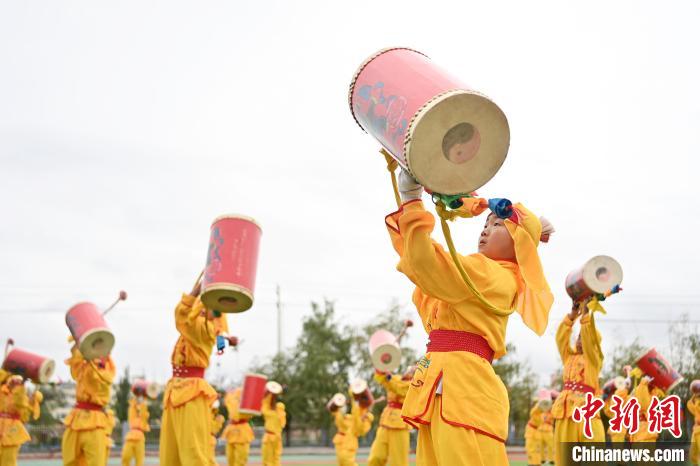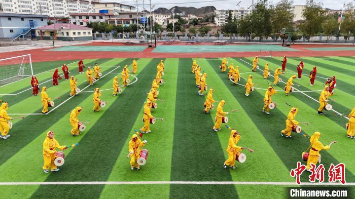 9月9日,甘肅省蘭州市皋蘭縣三川口學(xué)校學(xué)生練習(xí)蘭州太平鼓。近年來,皋蘭縣將國家級非物質(zhì)文化遺產(chǎn)蘭州太平鼓納入各中小學(xué)課后服務(wù)內(nèi)容,成立中小學(xué)太平鼓隊13支,定期邀請非遺傳承人走進(jìn)校園,進(jìn)行傳統(tǒng)文化授課和培訓(xùn),使學(xué)生親身感受中華優(yōu)秀傳統(tǒng)文化的魅力。蘭州太平鼓舞已有六百余年的歷史,素有“天下第一鼓”之稱,2006年被列入中國第一批非物質(zhì)文化遺產(chǎn)名錄。中新社記者 九美旦增 攝