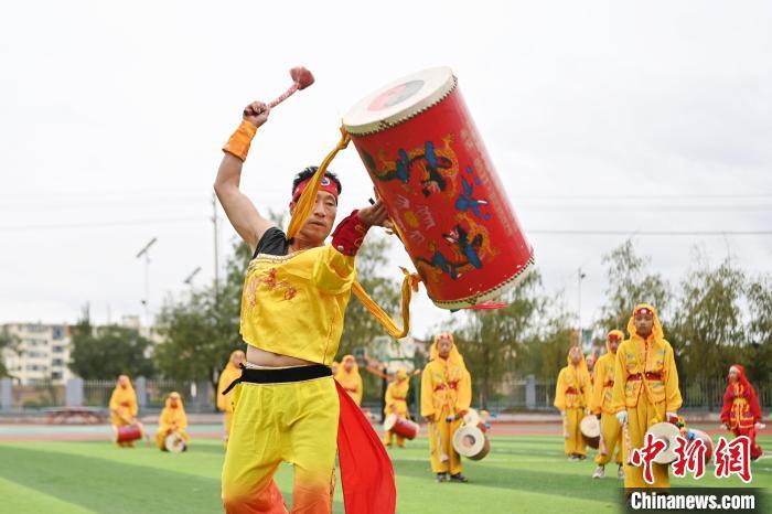 9月9日,甘肅省蘭州市皋蘭縣三川口學(xué)校學(xué)生練習(xí)蘭州太平鼓。中新社記者 九美旦增 攝