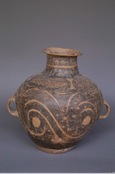 (四圈漩渦紋彩陶雙耳罐)