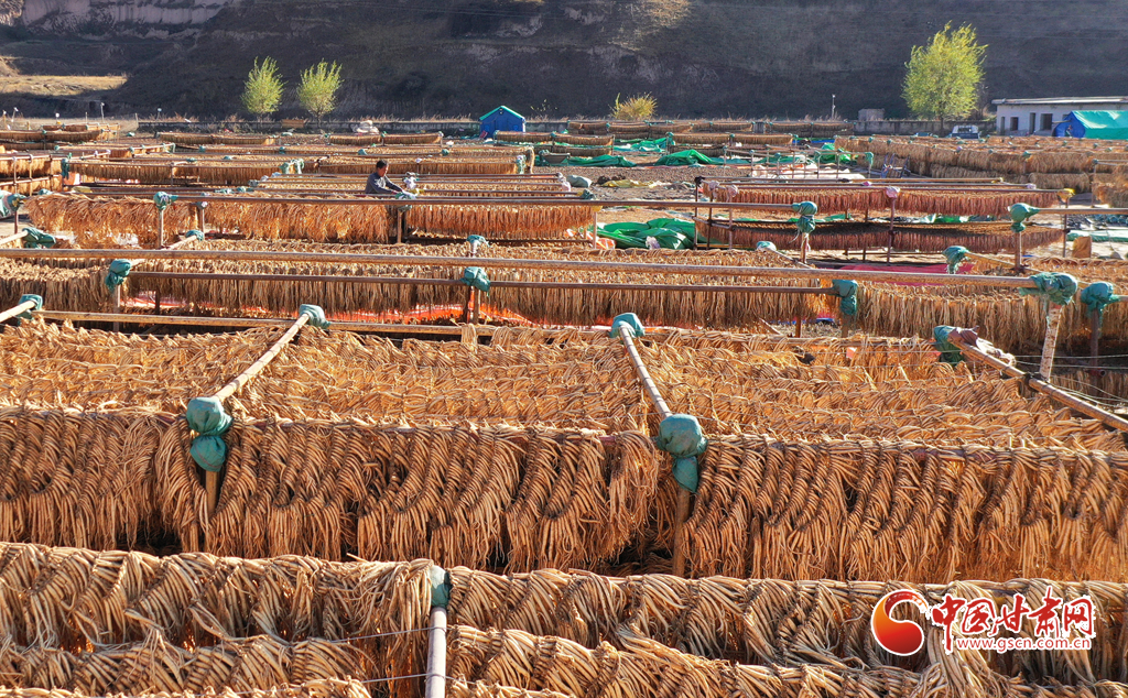 初冬時(shí)節(jié),天氣晴好,走進(jìn)岷縣十里鎮(zhèn),藥香四溢,隨處可見藥農(nóng)利用晴好天氣忙著晾曬中藥材的場(chǎng)景。