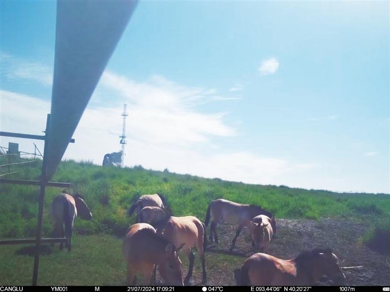 近日,甘肅敦煌西湖國(guó)家級(jí)自然保護(hù)區(qū)管護(hù)中心工作人員整理紅外相機(jī)拍攝畫面時(shí),發(fā)現(xiàn)拍攝到普氏野馬“哺乳”的清晰影像。畫面拍攝于今年7月下旬,有8匹普氏野馬繁殖群正在馬圈灣濕地的飲水泉附近活動(dòng),其中有一匹小馬駒滿足地吸吮著母馬的乳汁。據(jù)監(jiān)測(cè),該小馬駒出生于6月上旬,畫面中約已有一個(gè)半月大小,身體健康,毛色光亮。這個(gè)繁殖群領(lǐng)地范圍主要從馬圈灣西觀景臺(tái)至馬圈灣東高地,該區(qū)域可采食物種類豐富、水源充沛,是適合普氏野馬生活的美麗家園。普氏野馬是國(guó)家一級(jí)重點(diǎn)保護(hù)動(dòng)物,常棲息于山地、草原和荒漠,性機(jī)警、善奔跑。近年來,隨著敦煌西湖保護(hù)區(qū)生態(tài)環(huán)境保護(hù)力度加大,生態(tài)環(huán)境質(zhì)量持續(xù)改善,群眾保護(hù)野生動(dòng)植物的意識(shí)不斷增強(qiáng),使野生動(dòng)物活動(dòng)范圍不斷擴(kuò)大,種群數(shù)量不斷增加。截至目前,敦煌西湖保護(hù)區(qū)內(nèi)普氏野馬種群數(shù)量已達(dá)166匹。