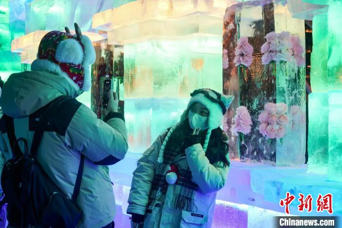 游客在哈爾濱冰燈藝術(shù)游園會打卡拍照 趙宇航 攝