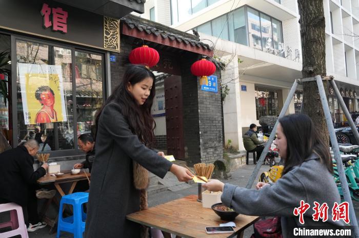 12月31日,四川成都,面館店主(左)為影迷發(fā)放自制的紀(jì)念卡片。中新社記者 安源 攝