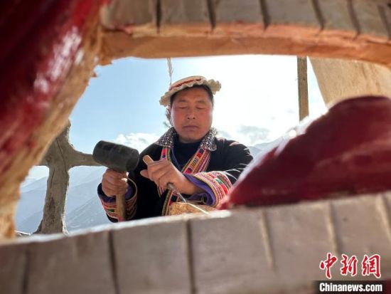 雕刻、打磨、上色……甘肅隴南市文縣鐵樓藏族鄉(xiāng)強(qiáng)曲村,白馬人薛剛一家四代人都精于木工。日前中新網(wǎng)記者走訪村子時(shí),薛剛坐在自家院子里,伏案制作池哥晝所用面具。池哥晝是白馬人保留最完整、最具特色民族舞蹈,面具是重要道具之一。薛剛制作的面具不僅用于周邊村子的池哥晝中,而且被廣州、上海等地的客商購買收藏。他時(shí)常將自己的想象融入面具中,用心打磨使其更具“靈氣”。他說,白馬人中從事面具雕刻的手藝人不多,最近他物色了一個(gè)“00后”徒弟,對(duì)方興趣濃厚,希望將這門手藝保護(hù)傳承好。圖為薛剛在院子里雕刻面具。閆姣 攝