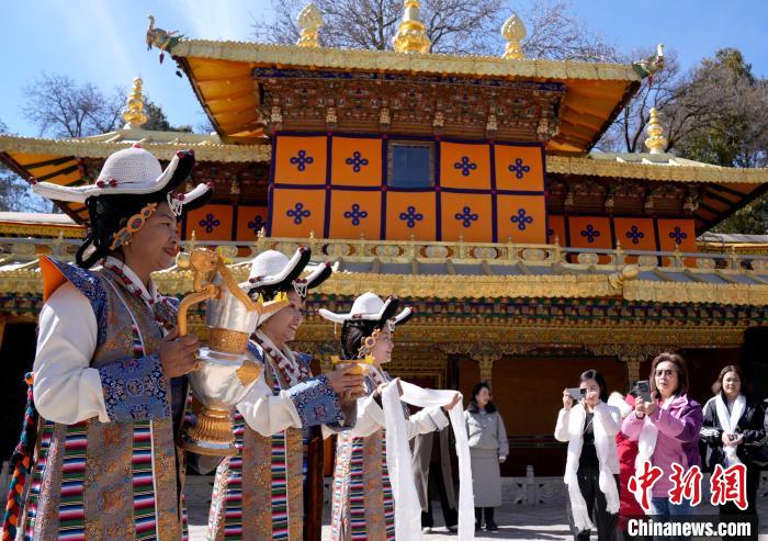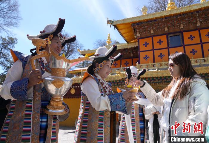 2月20日,由西藏自治區(qū)文化和旅游廳舉辦的2025年香港至拉薩航班首航旅行團(tuán)歡迎儀式在羅布林卡舉行。來自香港的游客將前往布達(dá)拉宮、大昭寺等地,開啟冬游西藏旅途。2月19日,拉薩至香港的首條地區(qū)航線正式開通。航線的開通,更加便捷了兩地居民的出行,也將進(jìn)一步促進(jìn)兩地在旅游、文化、經(jīng)貿(mào)等領(lǐng)域的交流與合作。圖為歡迎儀式現(xiàn)場(chǎng),工作人員向香港游客敬獻(xiàn)青稞酒。中新社記者 李林 攝