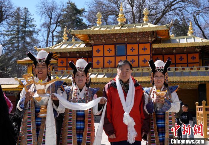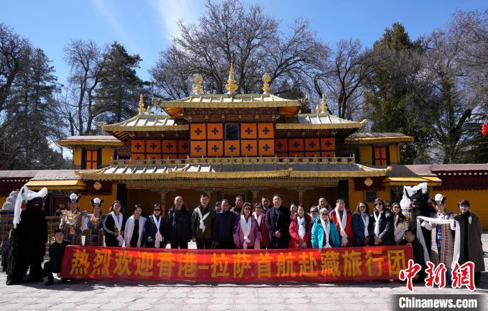 圖為歡迎儀式現(xiàn)場(chǎng),香港游客在羅布林卡與工作人員合影留念。中新社記者 李林 攝