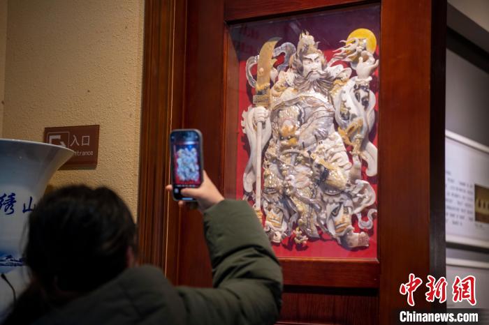 2月3日,游客在廣西北海貝雕博物館拍攝貝雕作品《日月門(mén)神》?!£惽锵?nbsp;攝