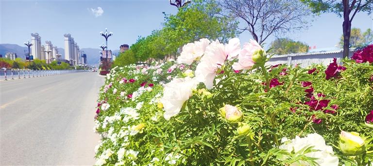 立夏之際,榆中縣興隆山大道兩旁各式各樣的牡丹花競相開放,白的、粉的、紫的花朵嬌艷欲滴;和平天香山、范家營、牡丹園、高崖湖灘、馬坡上莊、城關(guān)大坡坪、馬啣山麓……高山大河的榆中,從每年的4月底到8月,隨著階梯狀的地勢變化,由北而南,延伸了牡丹花的觀賞期限,更使得當?shù)厝罕娒撠氈赂?,笑如花開。