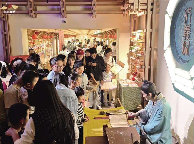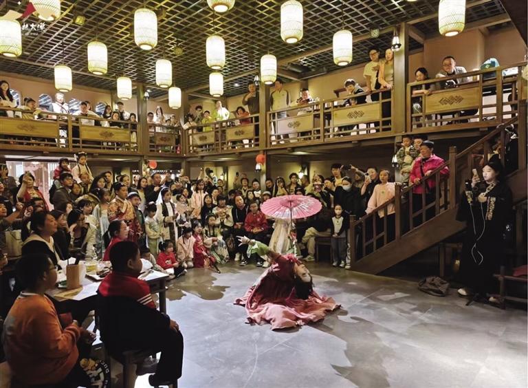 “諸位小友近來可好?”“好!”在街區(qū),NPC們與游客的互動成為一大亮點。為了讓游客更好地沉浸其中,街區(qū)里的“蘭裳閣”專門提供服裝出租和妝造設(shè)計服務(wù)。游客們在這里換上漢服、做好造型,“穿越”成古人與NPC們共同沉浸在這場歷史旅行中。張偉彥在“龍門客棧”工作快半年了,飾演店小二馬一刀。他對角色有著自己的理解:“導(dǎo)演讓我演店小二,大家印象里店小二都是機靈、腿腳快的。但我演的這個店小二帶著江湖氣息,他藏在龍門客棧,其實是個刀客,在這里打工是為了打探消息,畢竟龍門客棧可是江湖消息的聚集地。”記者走在街區(qū),時不時就能看到他拿著草帽,熱情地招呼游客玩接帽子游戲。遇到靦腆不敢嘗試的游客,他也會不斷鼓勵,有時候碰上外國游客,他還隨口說幾句英語與其互動。