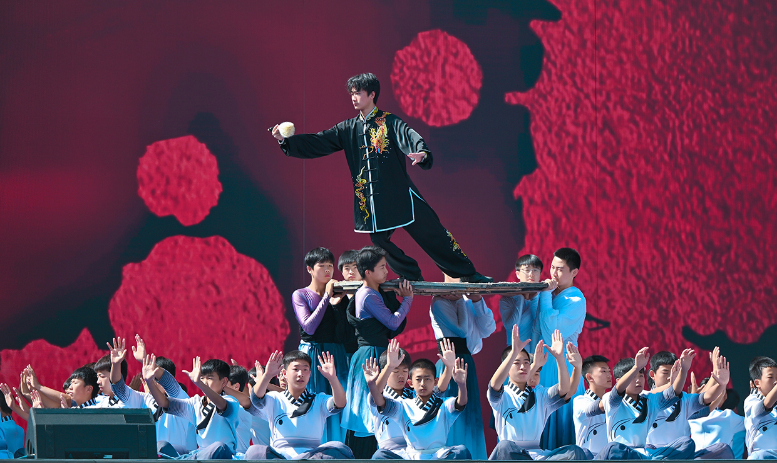 活動(dòng)伊始,開場(chǎng)片《歡迎乘坐崆峒號(hào)》以“環(huán)西部火車游·崆峒號(hào)”平?jīng)雎糜螌A袨殪`感,通過跨時(shí)空對(duì)話串聯(lián)崆峒山古今脈絡(luò),拉開活動(dòng)序幕。現(xiàn)場(chǎng),街舞與崆峒武術(shù)團(tuán)體合作的《武韻崆峒》展現(xiàn)武術(shù)與現(xiàn)代肢體藝術(shù)新生機(jī);笛子演奏與武術(shù)冠軍聯(lián)袂呈現(xiàn)的《崆音劍影》打造“可聽的武術(shù)”沉浸式體驗(yàn);30人陣容的江蘇武協(xié)女子太極拳團(tuán)體演繹《鶴起崆峒》,詮釋武術(shù)新功用;國(guó)風(fēng)歌手與秦腔表演藝術(shù)家合作的《秦韻長(zhǎng)歌》,展現(xiàn)“武戲同源”的多元魅力。
