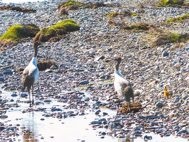 甘肅祁連山國家級自然保護(hù)區(qū)管護(hù)中心出現(xiàn)的三只黑頸鶴。新甘肅·甘肅日報通訊員 李海軍