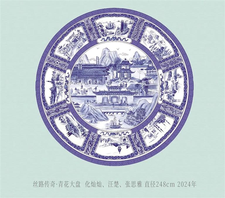 值得關(guān)注的是,展品中既有莫高窟第328窟復(fù)制彩塑這樣的經(jīng)典再現(xiàn),也有直徑達248厘米的“絲路傳奇·青花大盤”,呈現(xiàn)出多元文明共生的歷史圖景。瓷器作品是江西瓷藝大師歷時多年、多次赴敦煌采風創(chuàng)作的結(jié)晶,通過高溫顏色釉的窯變特性,將敦煌壁畫的斑駁肌理與礦物顏料的神秘色彩凝固定格,在釉色流淌間實現(xiàn)古典美學(xué)與現(xiàn)代工藝的完美融合。