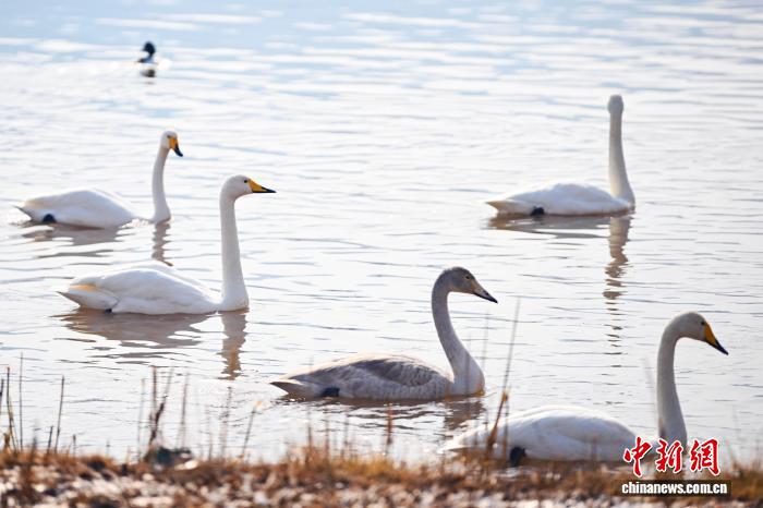 12月9日,在位于甘肅省蘭州市西固區(qū)達(dá)川鎮(zhèn)三河口濕地,從西伯利亞而來的白天鵝嬉戲。據(jù)悉,該地屬于黃河、湟水、大通河三河交匯之處,生態(tài)環(huán)境良好,擁有1200畝蘆葦蕩。近年來,該地吸引越來越多來自西伯利亞的白天鵝選擇在此停歇棲息。中新社記者 李亞龍 攝